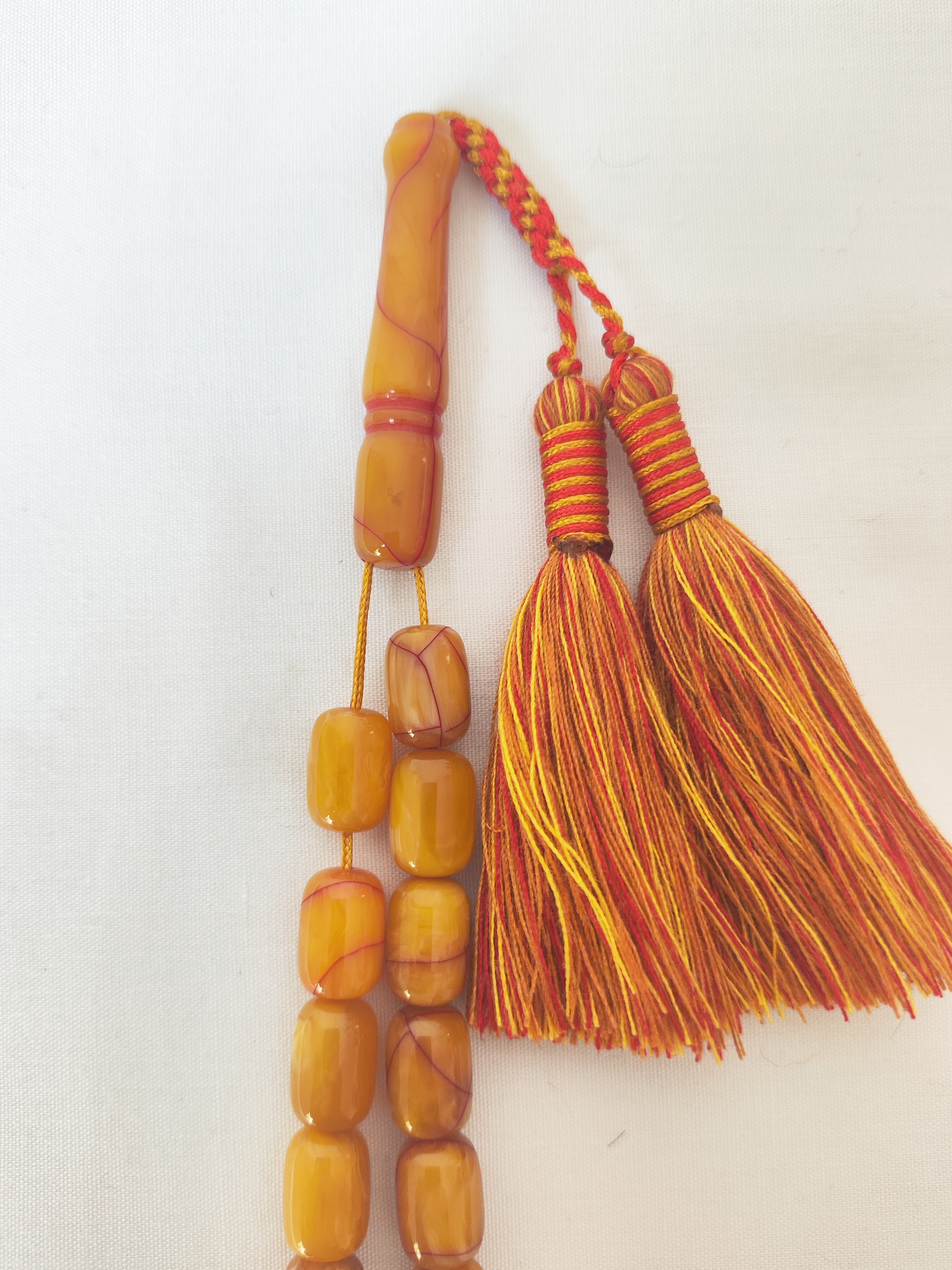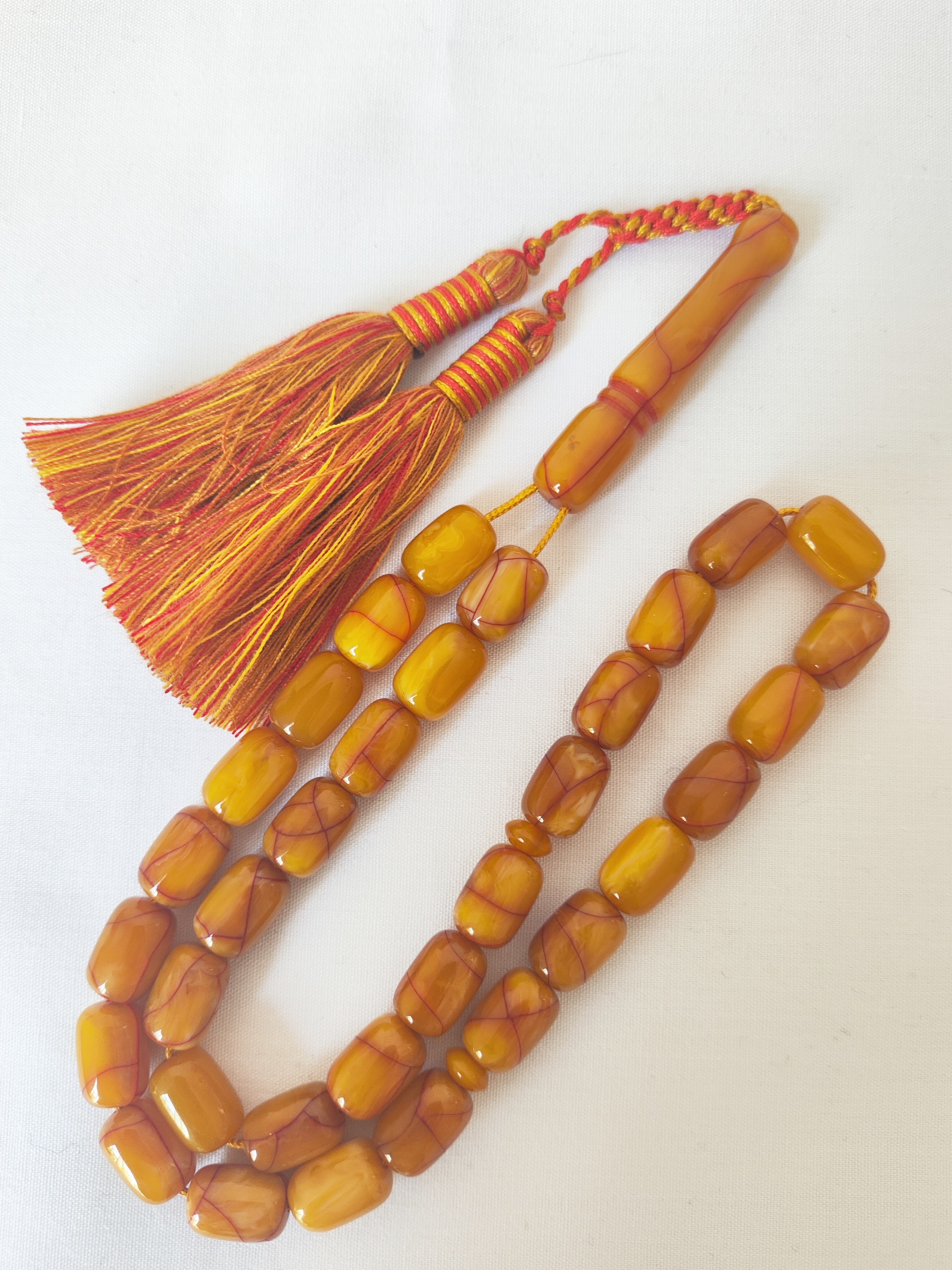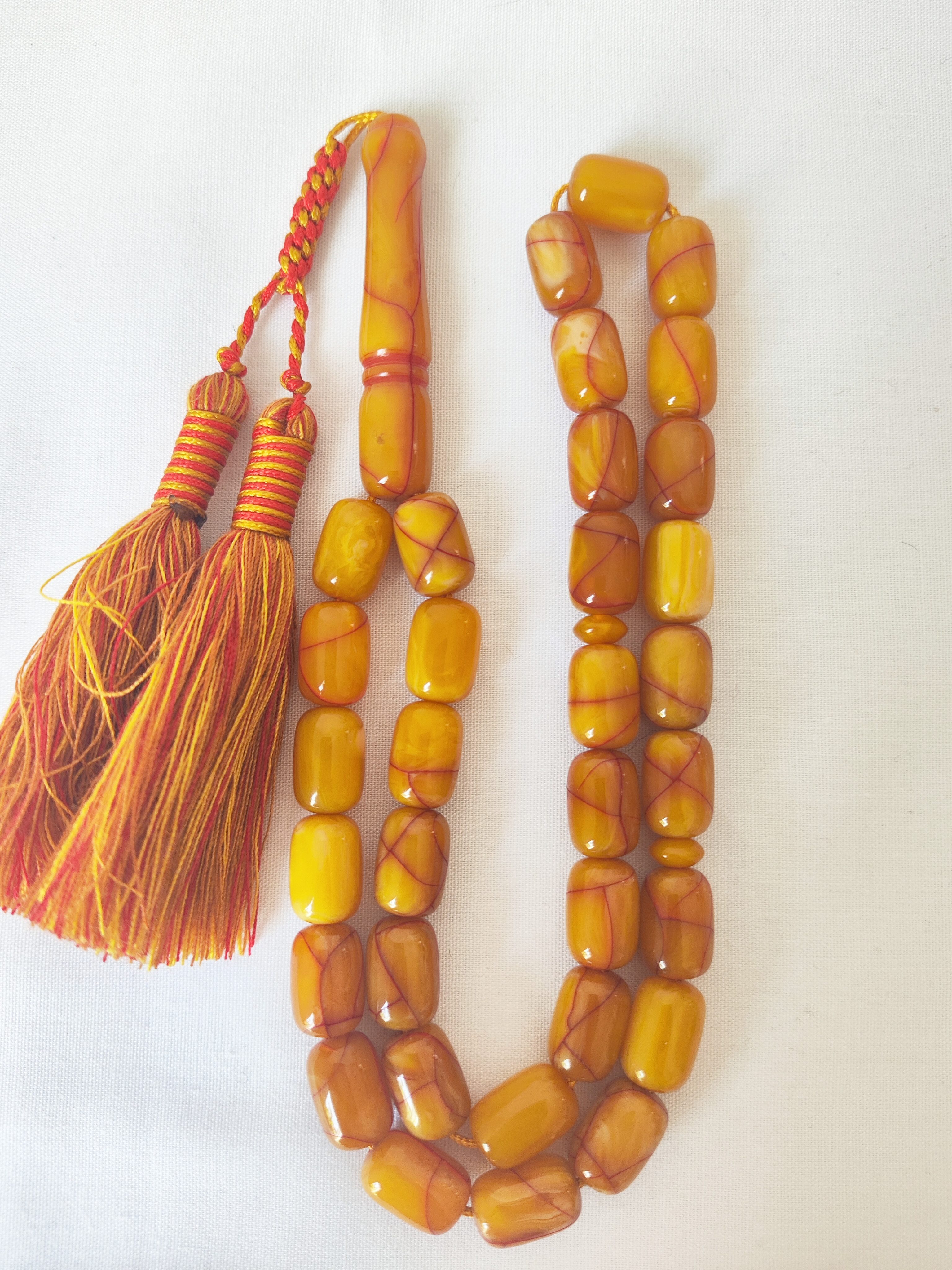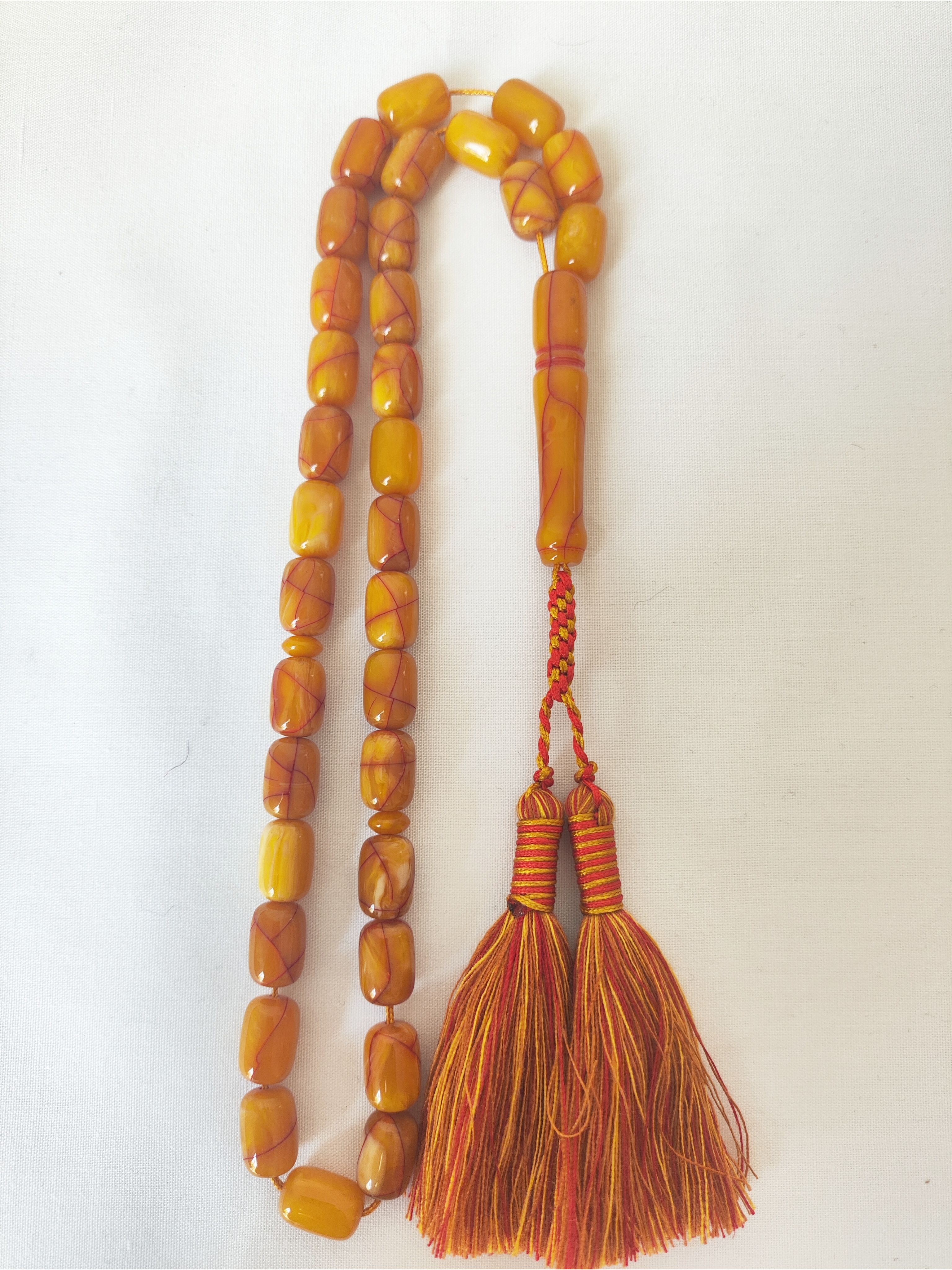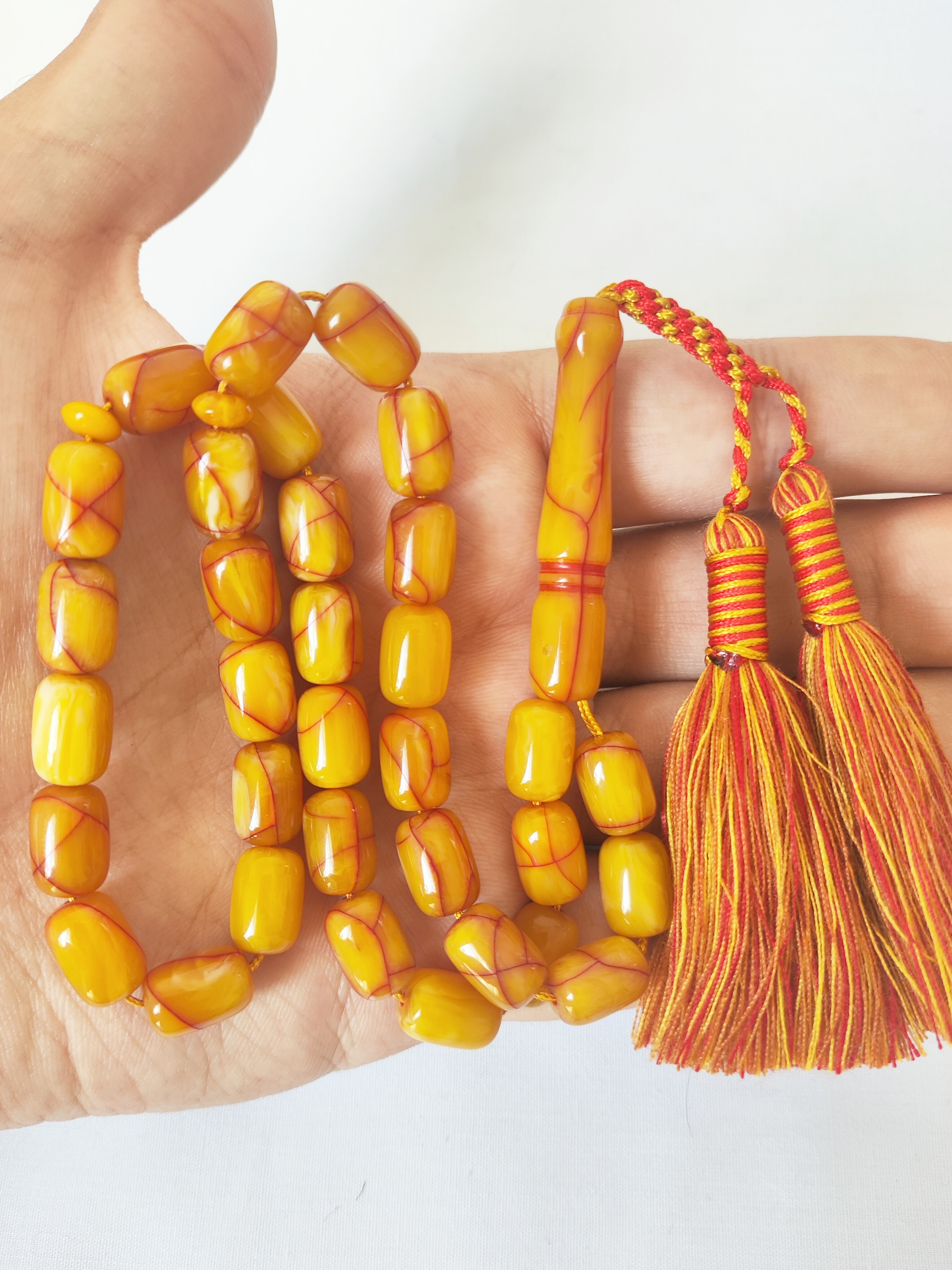 تسبیح کهربا رگه دار 33عددی رنگ زرد کاراملی خوشدست و فاخر همراه بافت شکیل