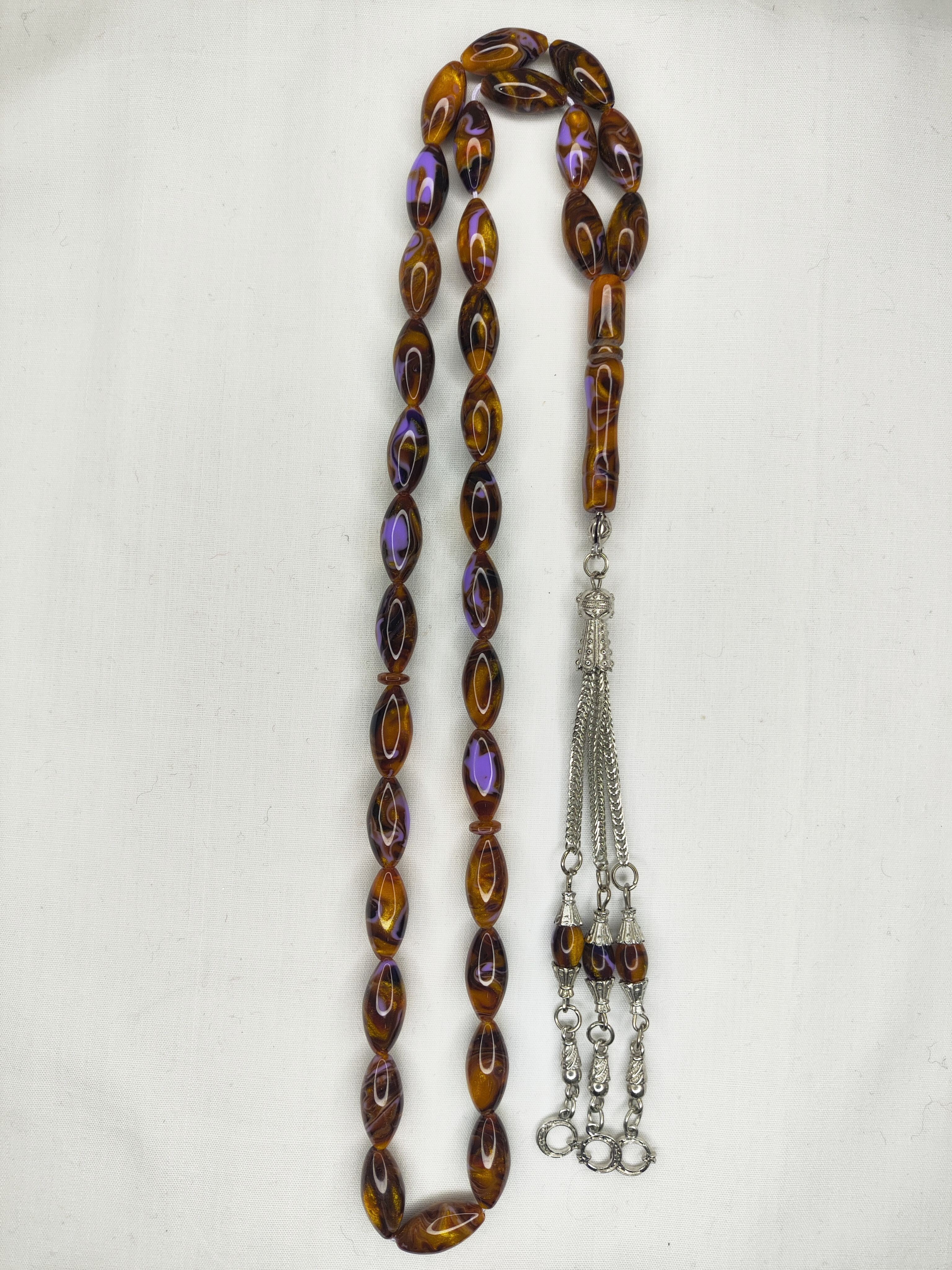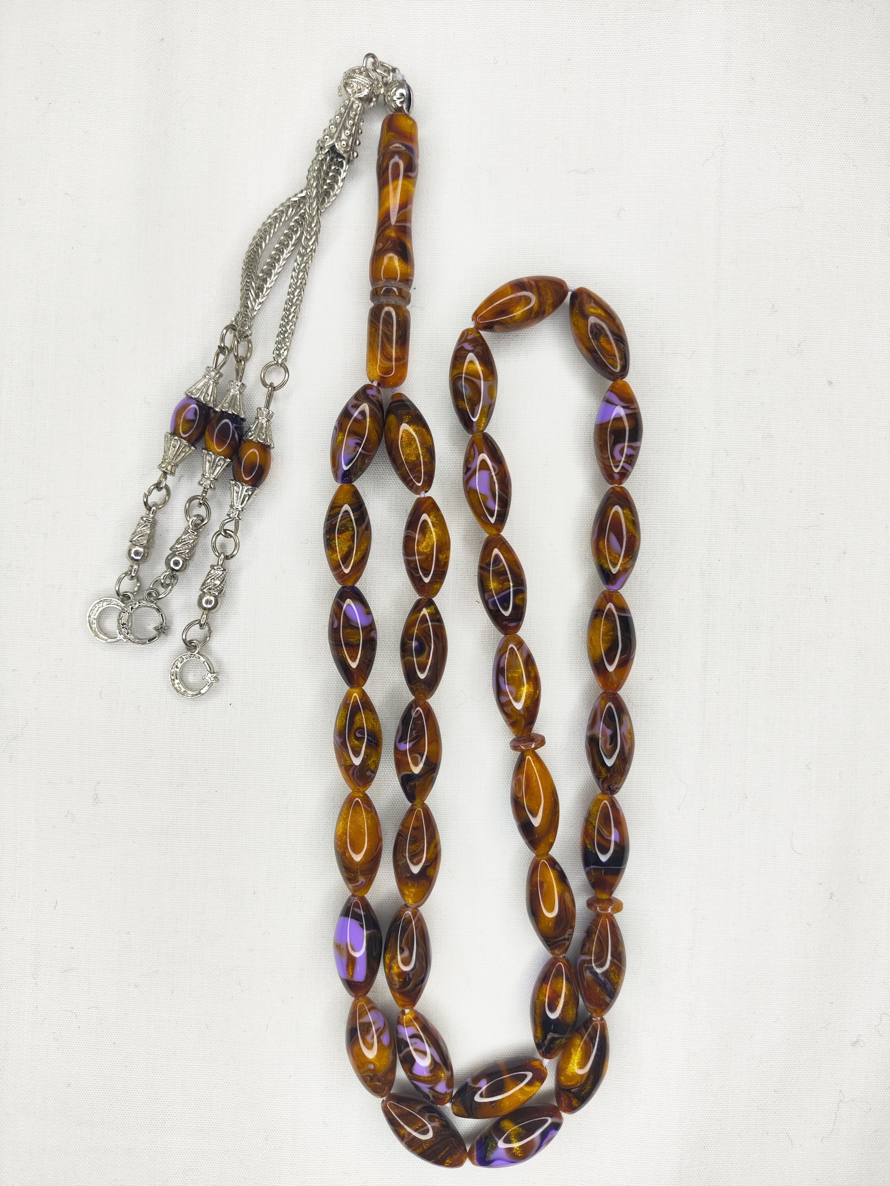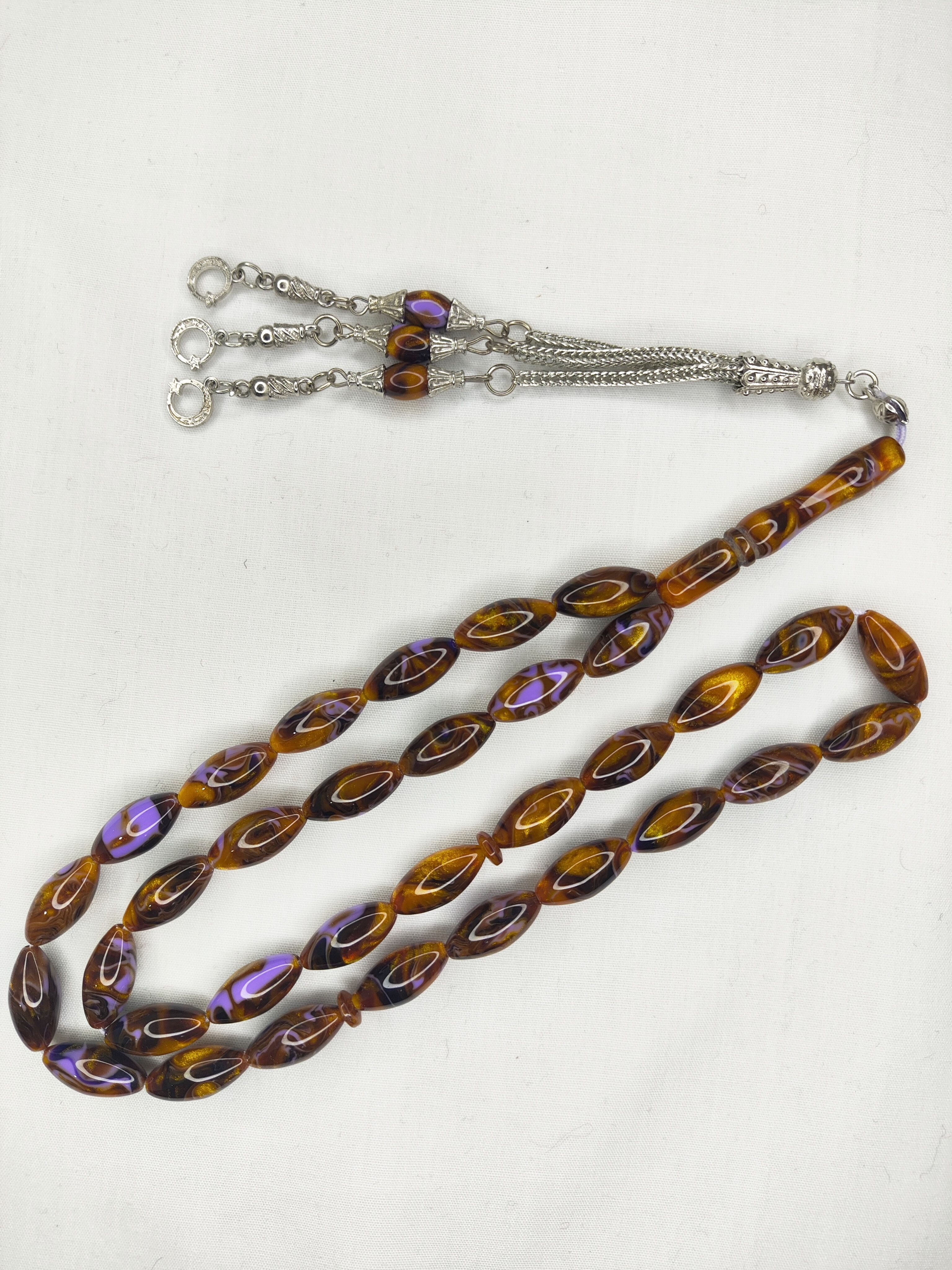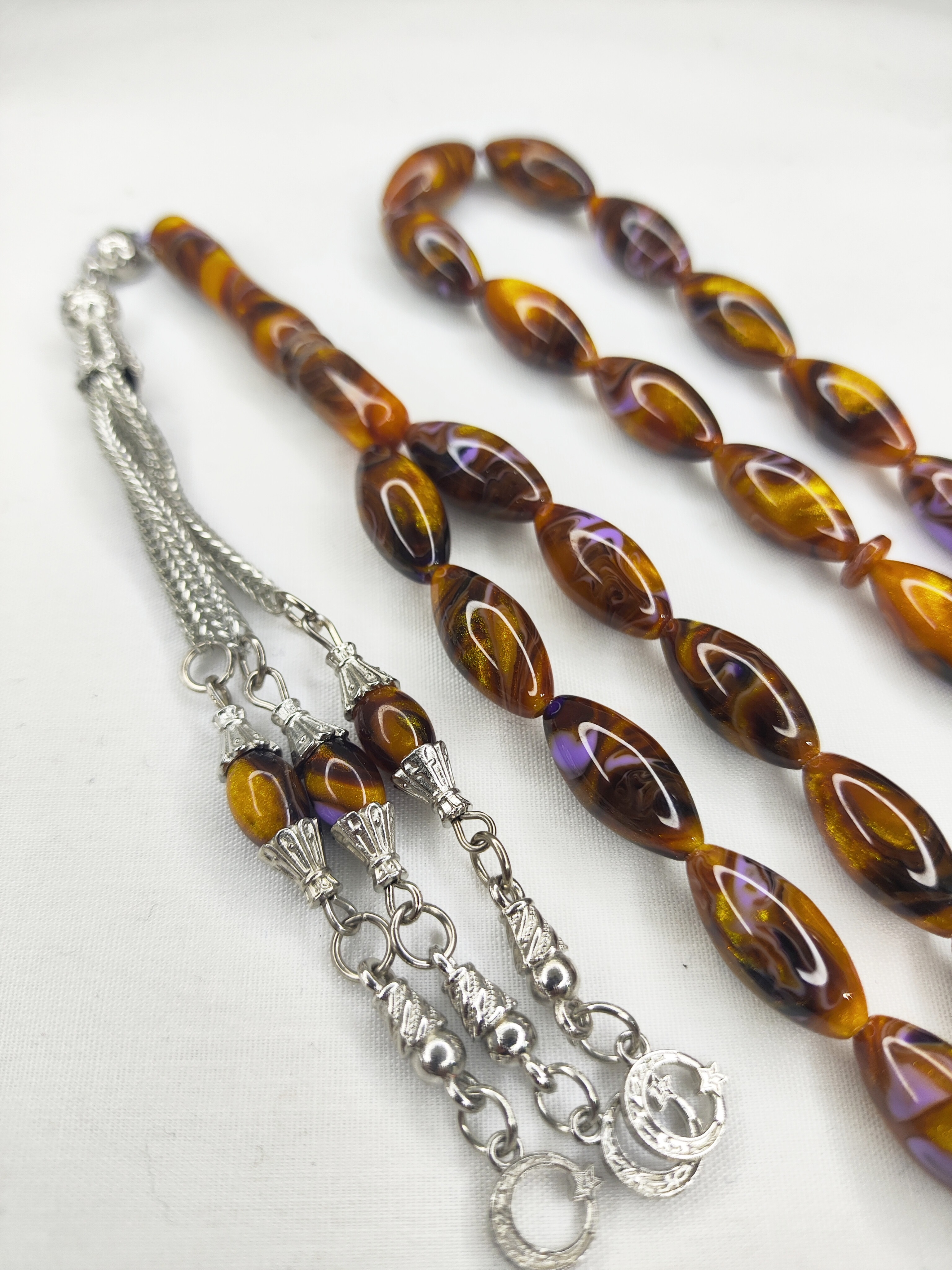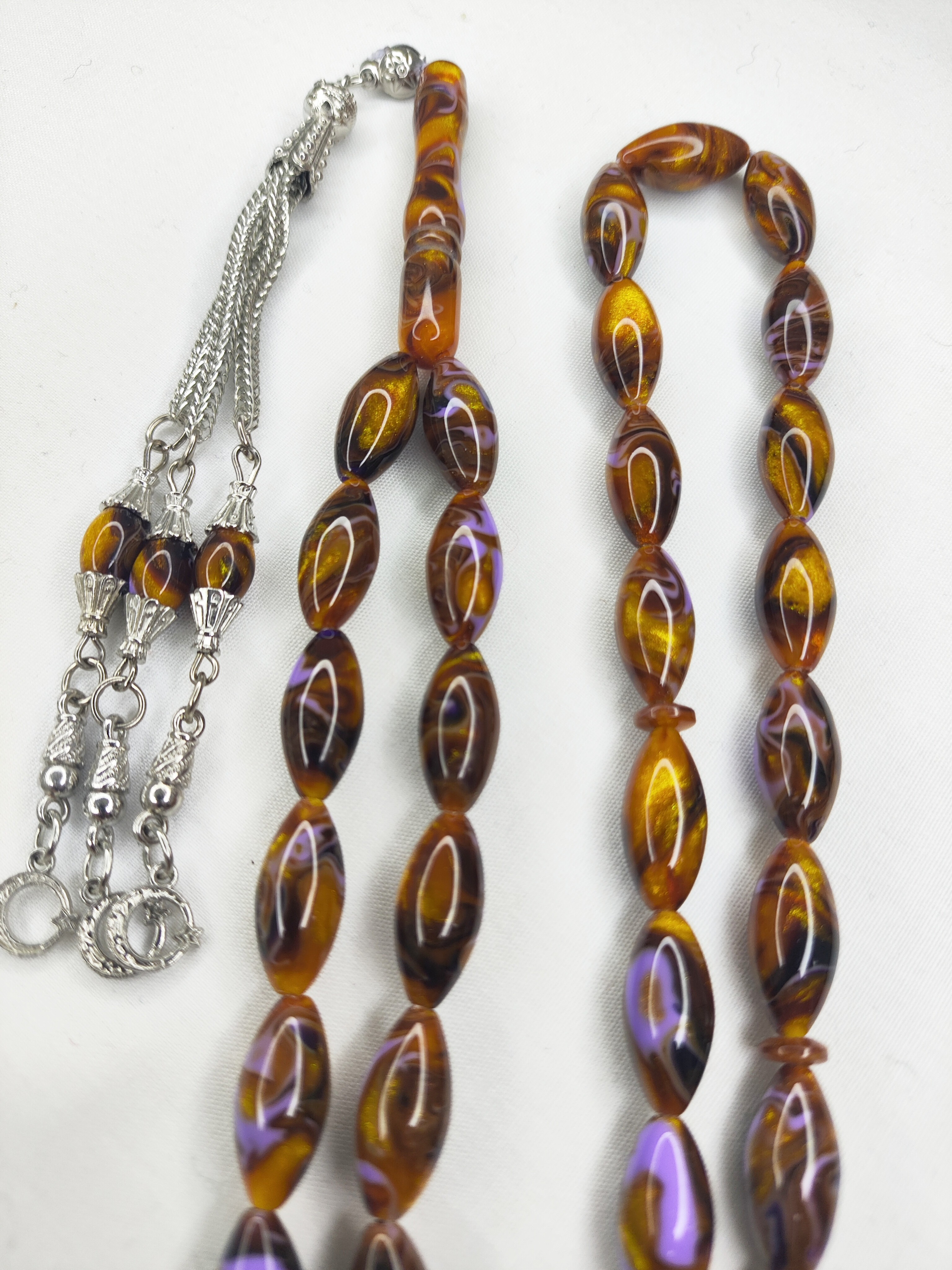 تسبیح کهربا زرافشان 33عددی رنگ خاص تراش هلی خوشدست همراه سر تسبیح استیل شکیل