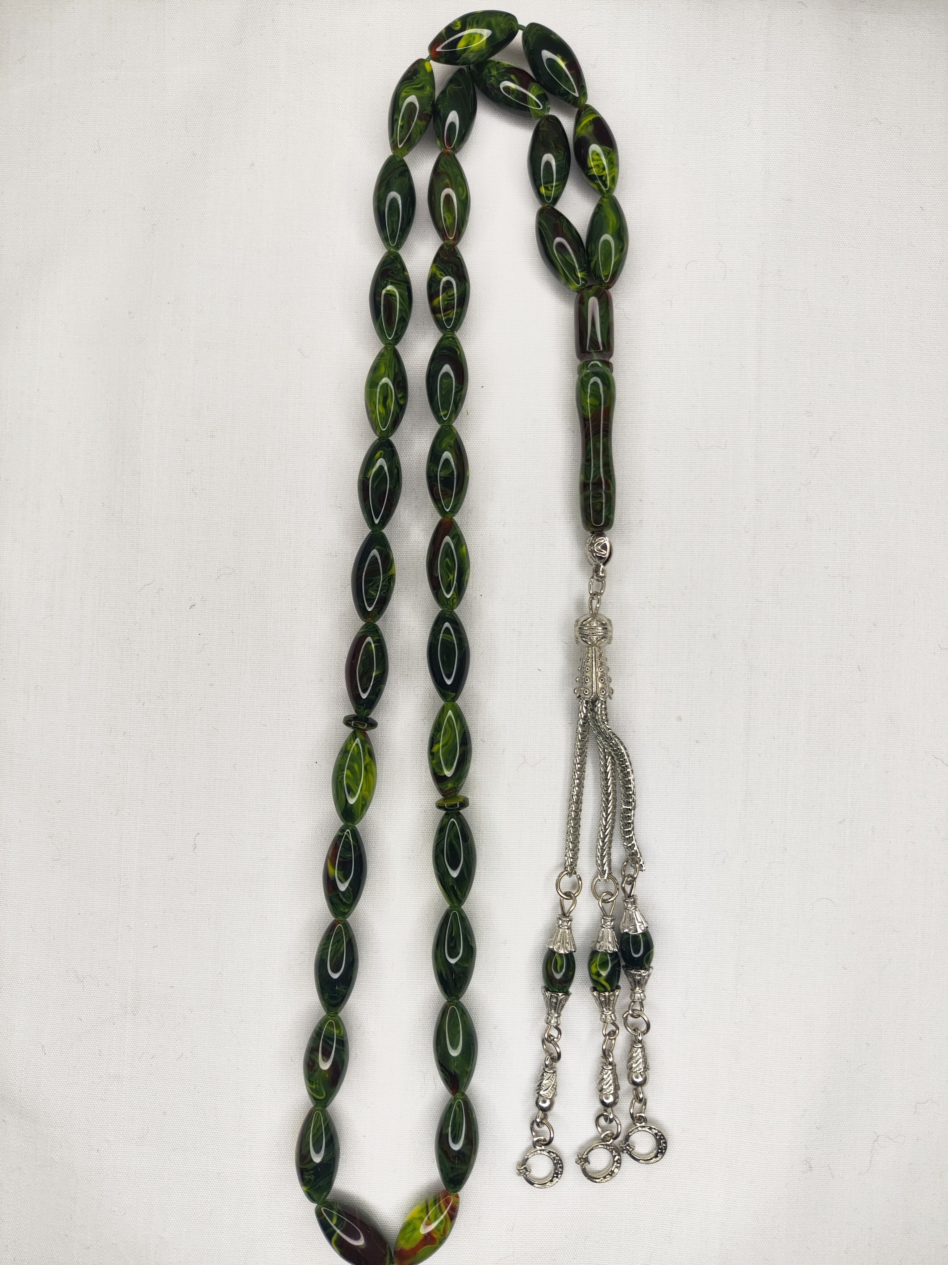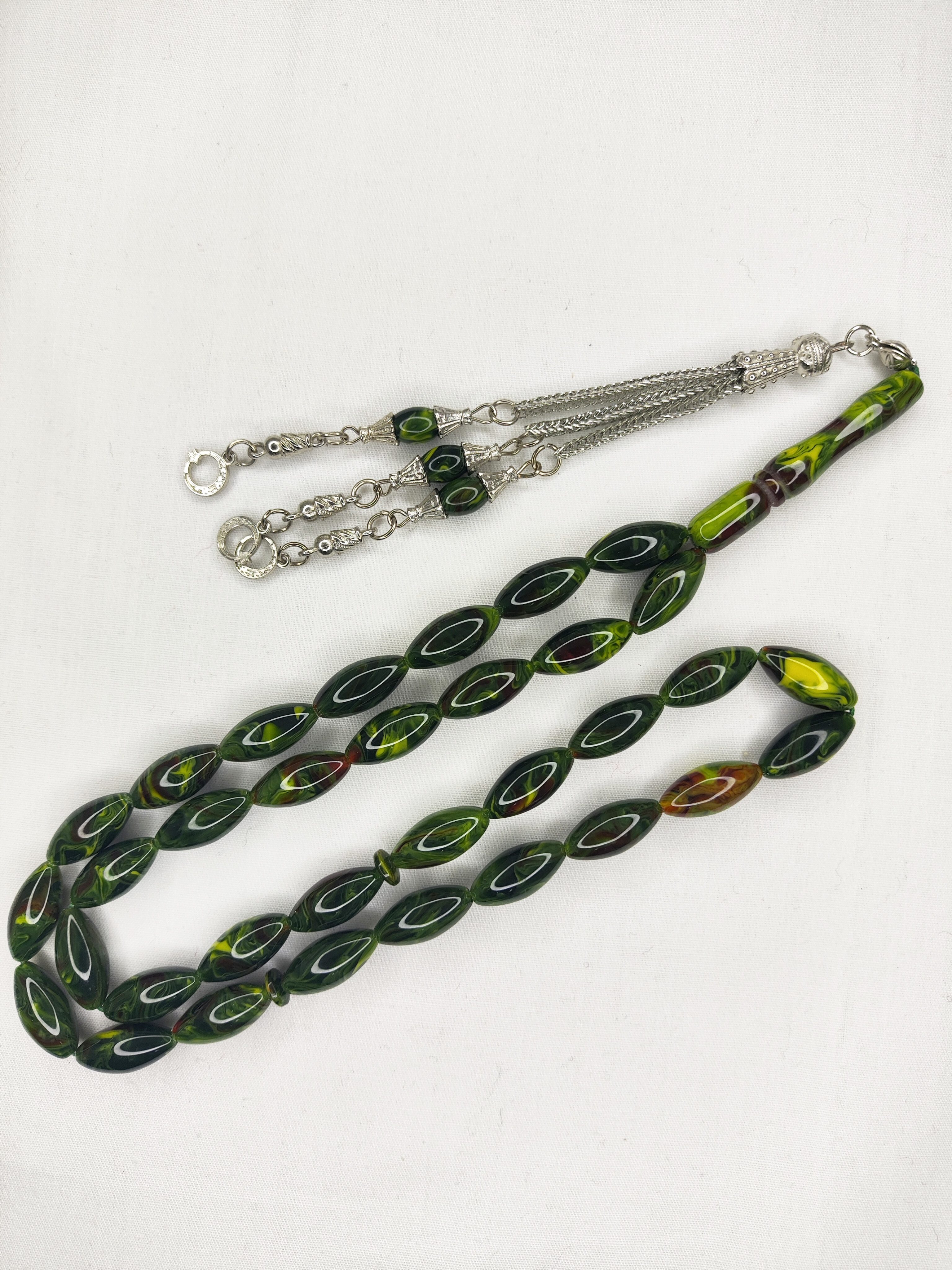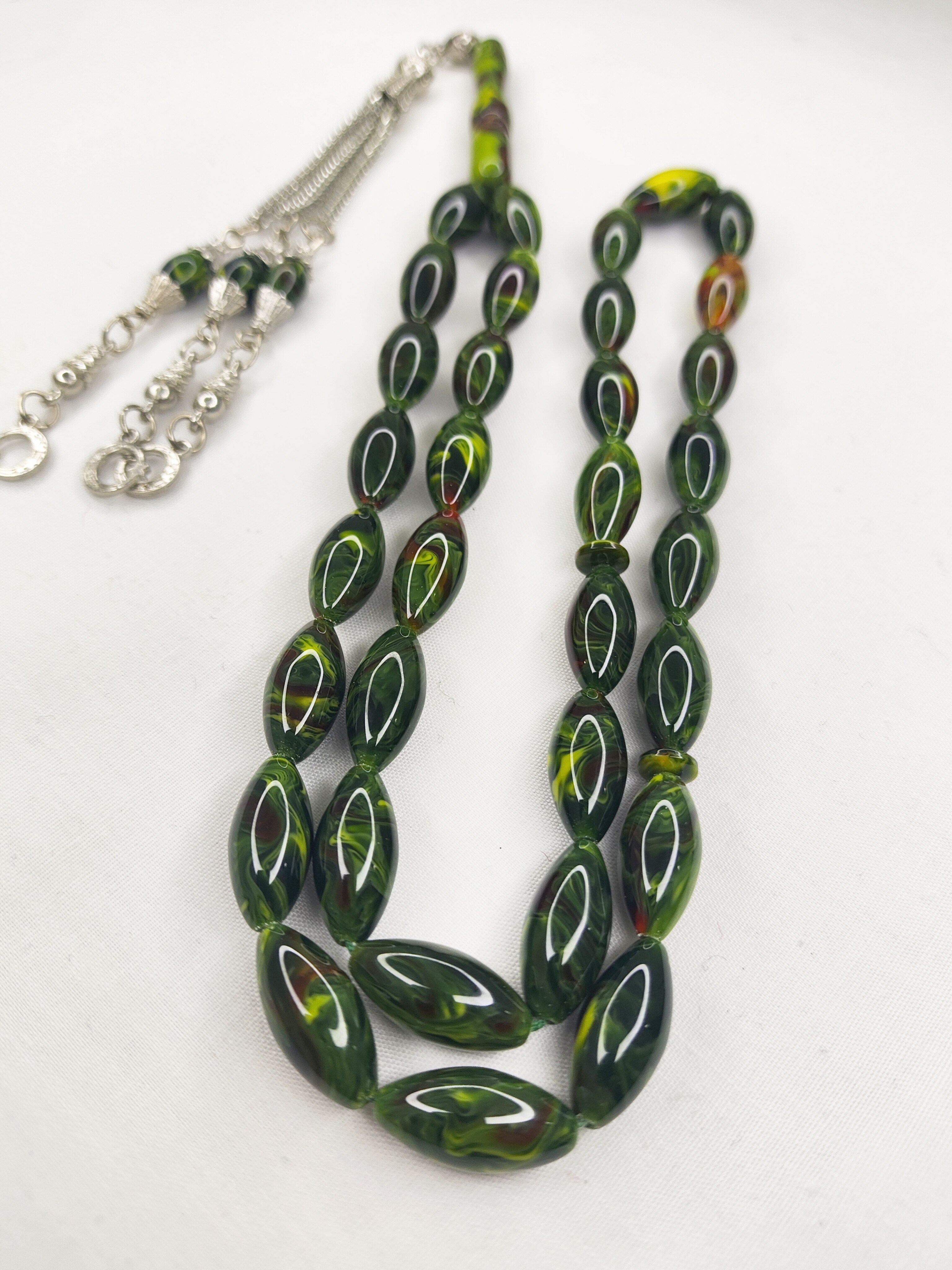 تسبیح کهربا رگه دار پرچمی 33عددی تراش هلی خوشدست همراه سر تسبیح استیل شکیل