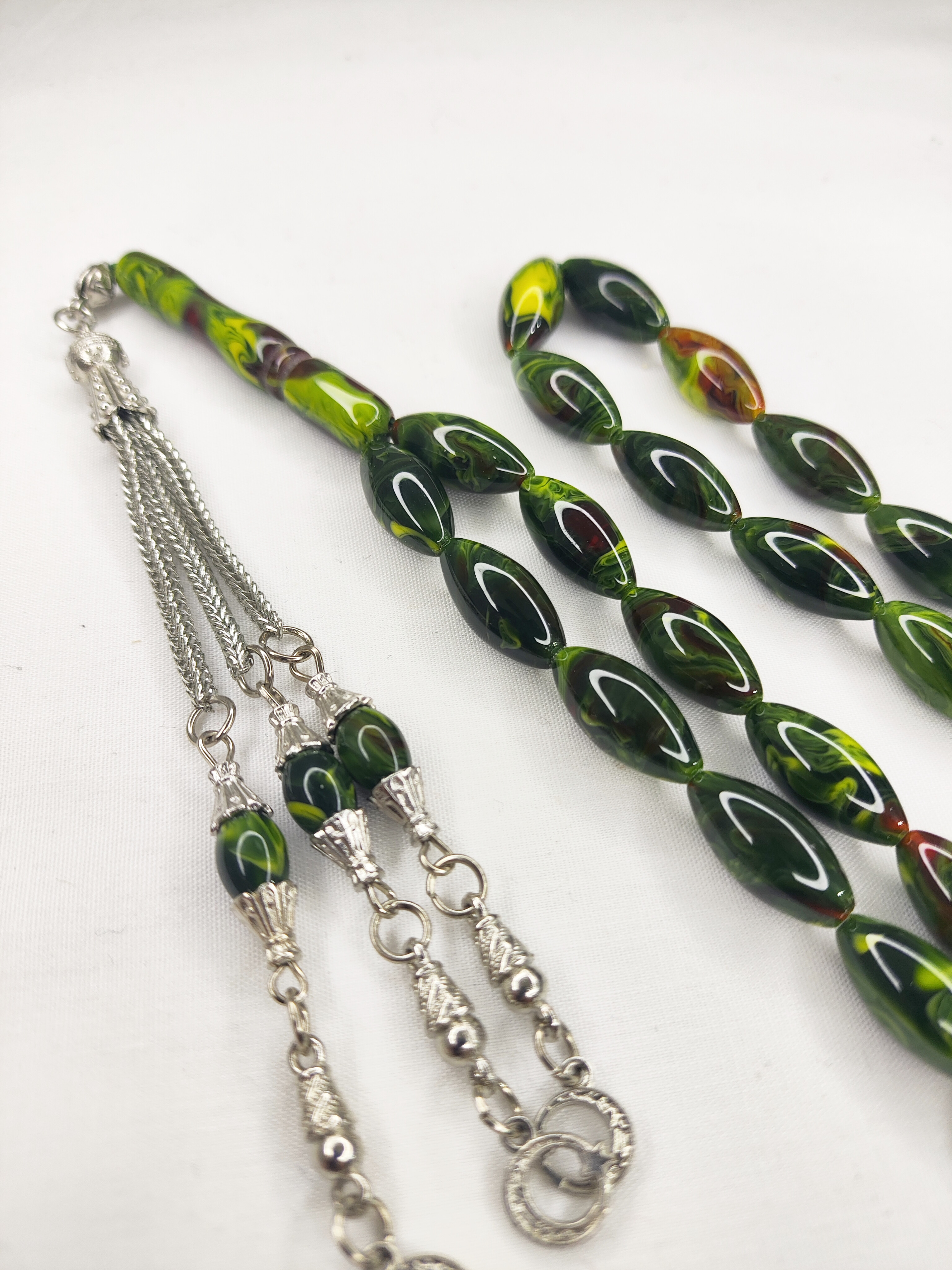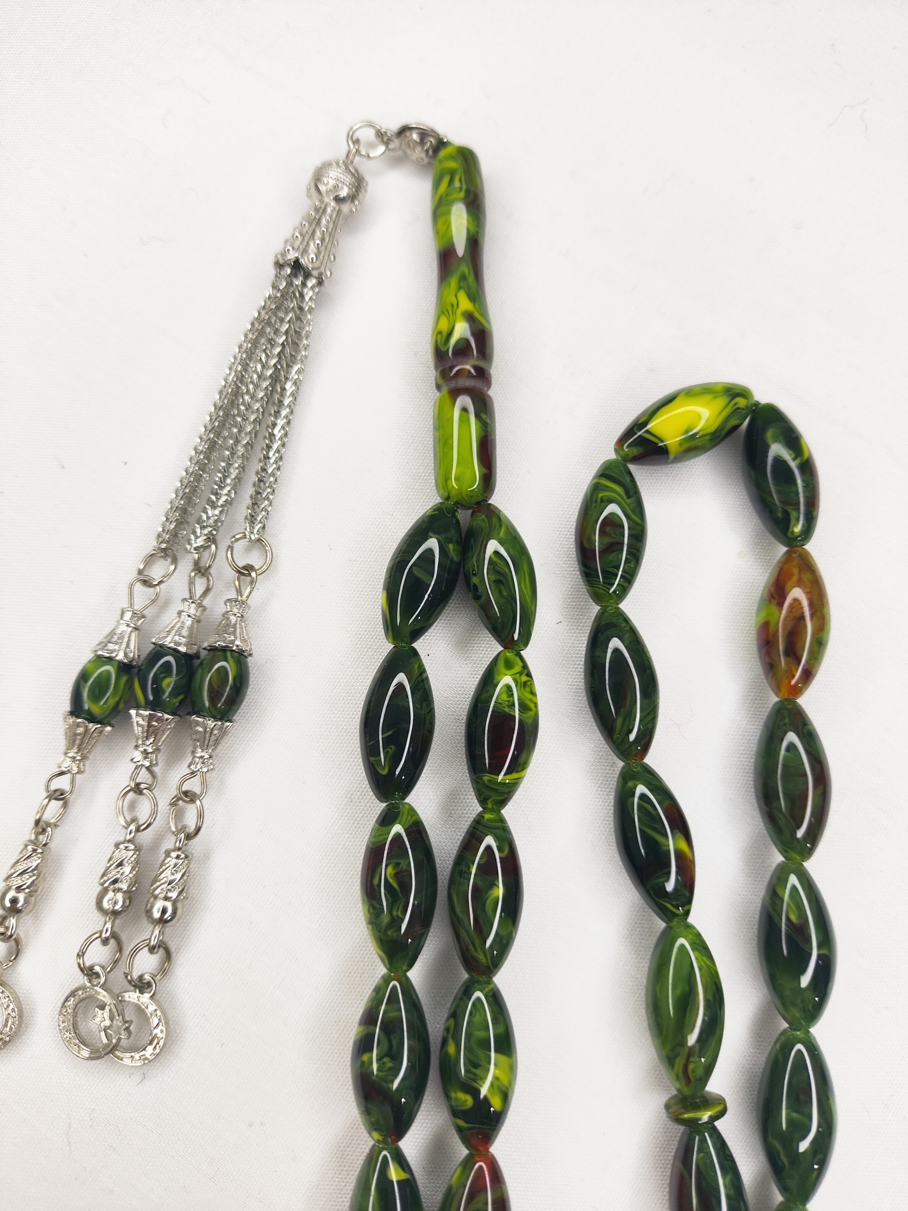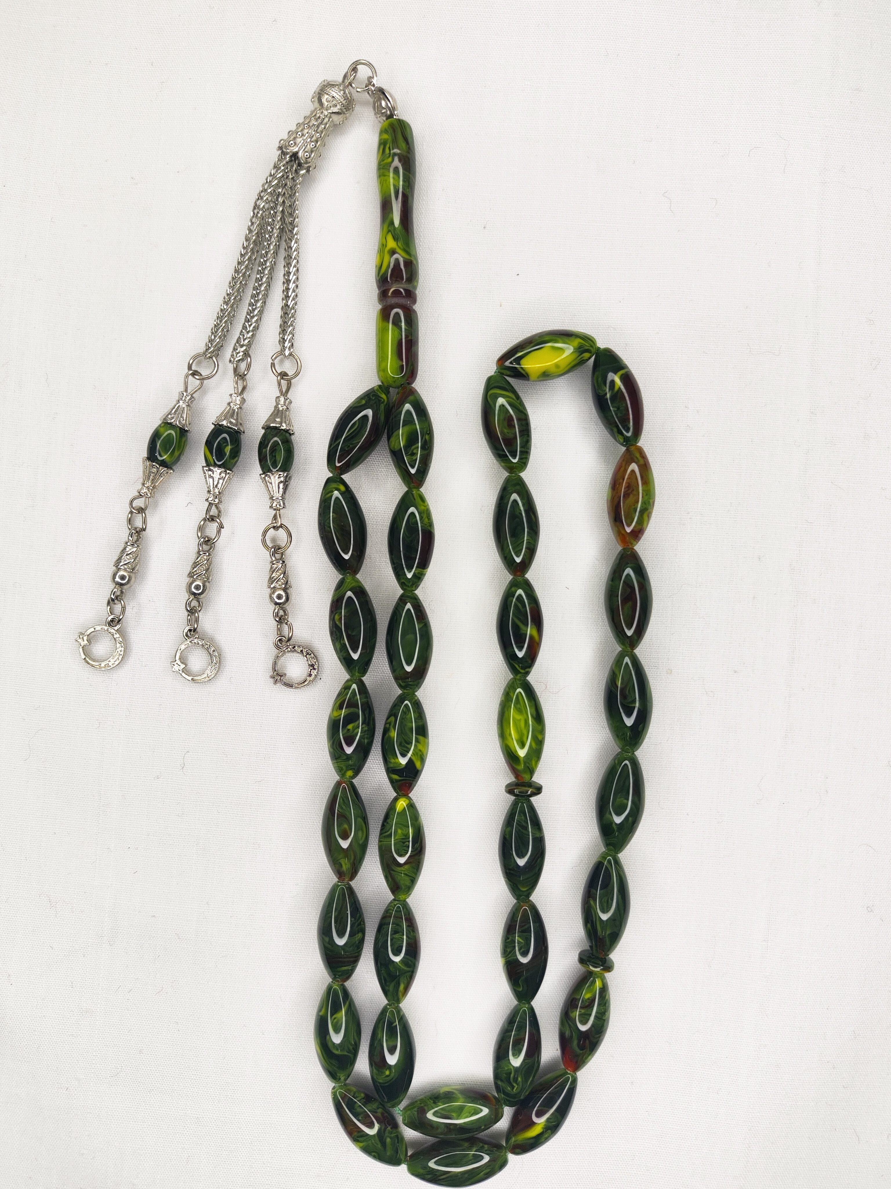 تسبیح کهربا رگه دار پرچمی 33عددی تراش هلی خوشدست همراه سر تسبیح استیل شکیل
