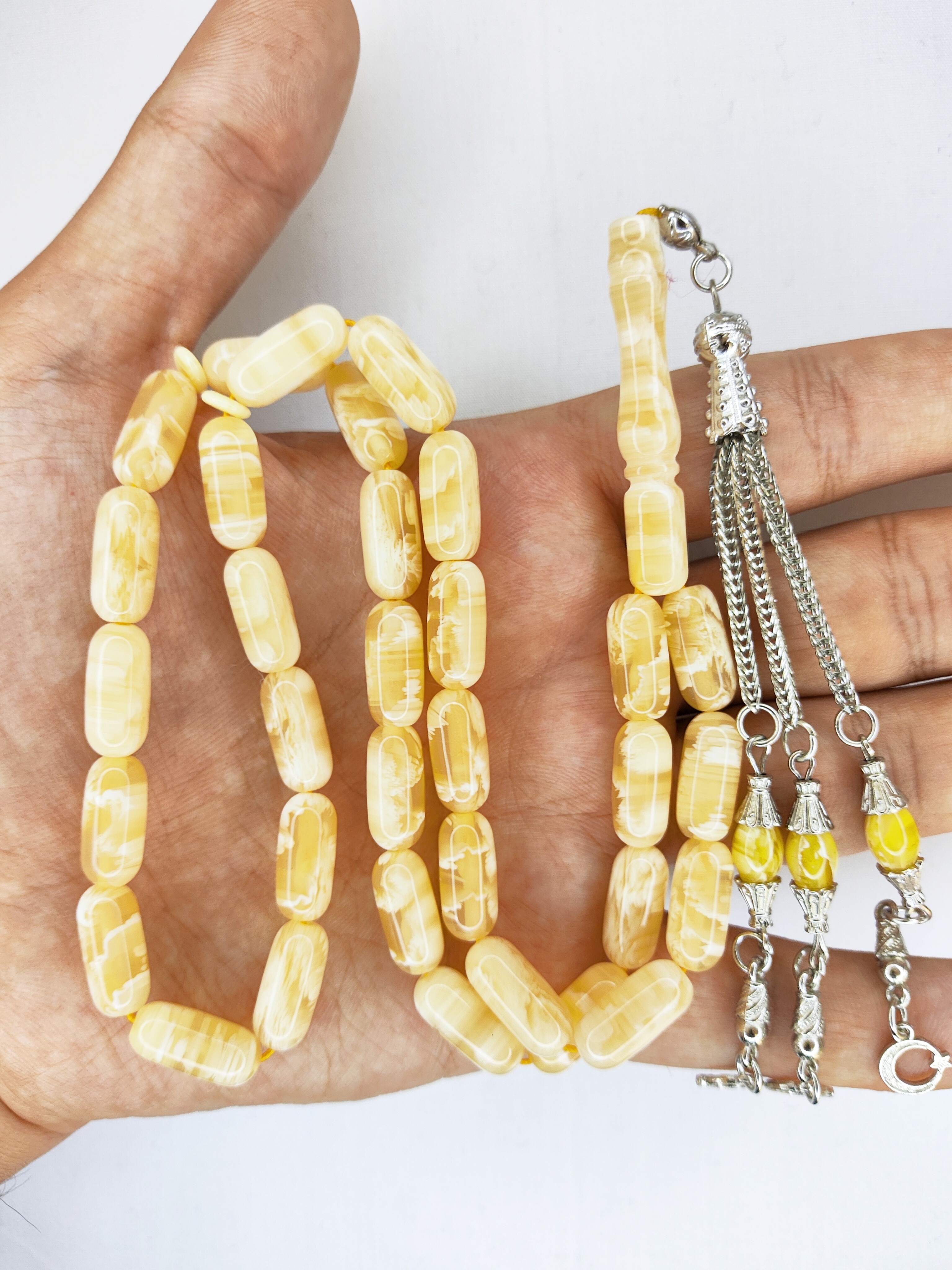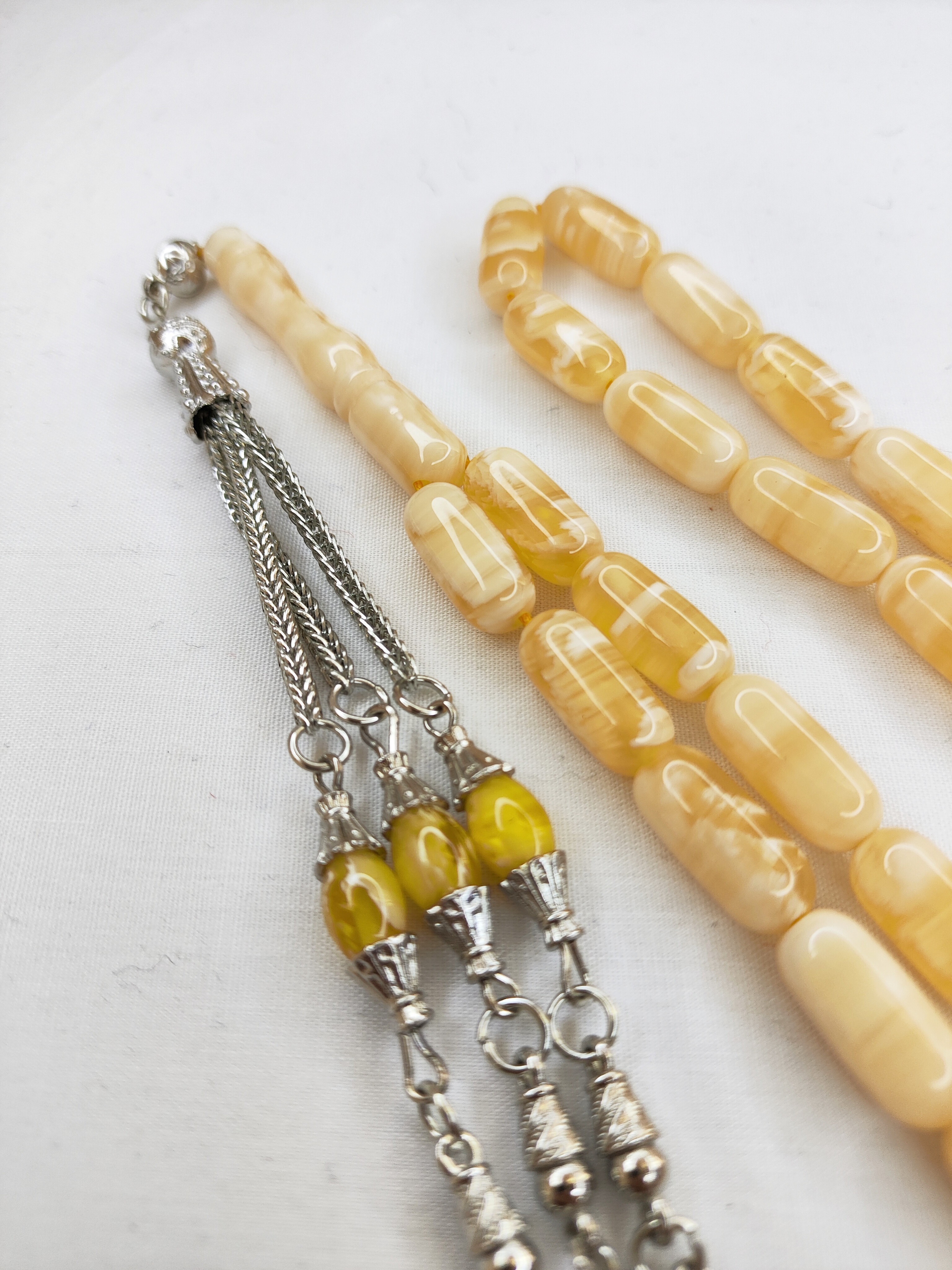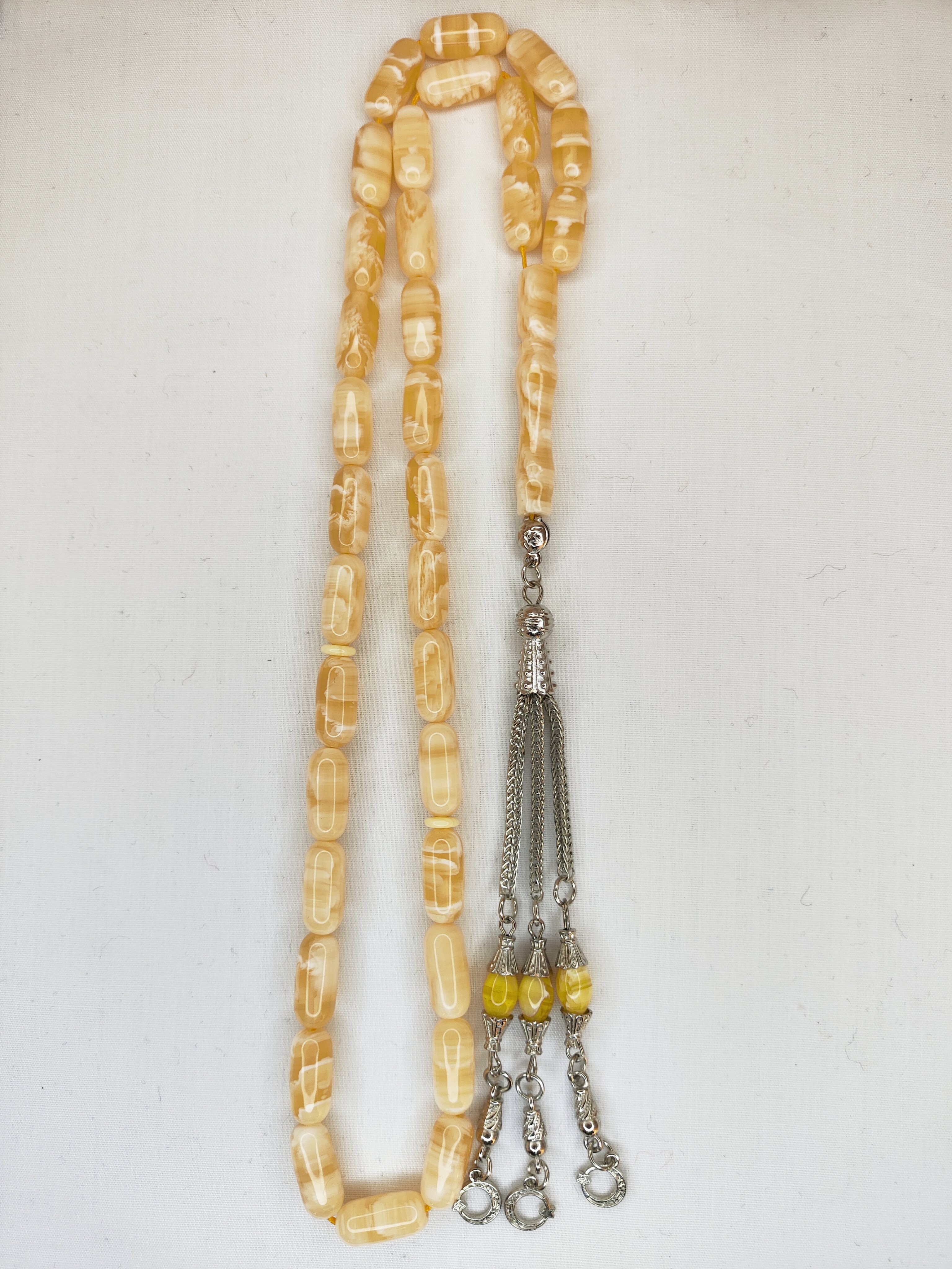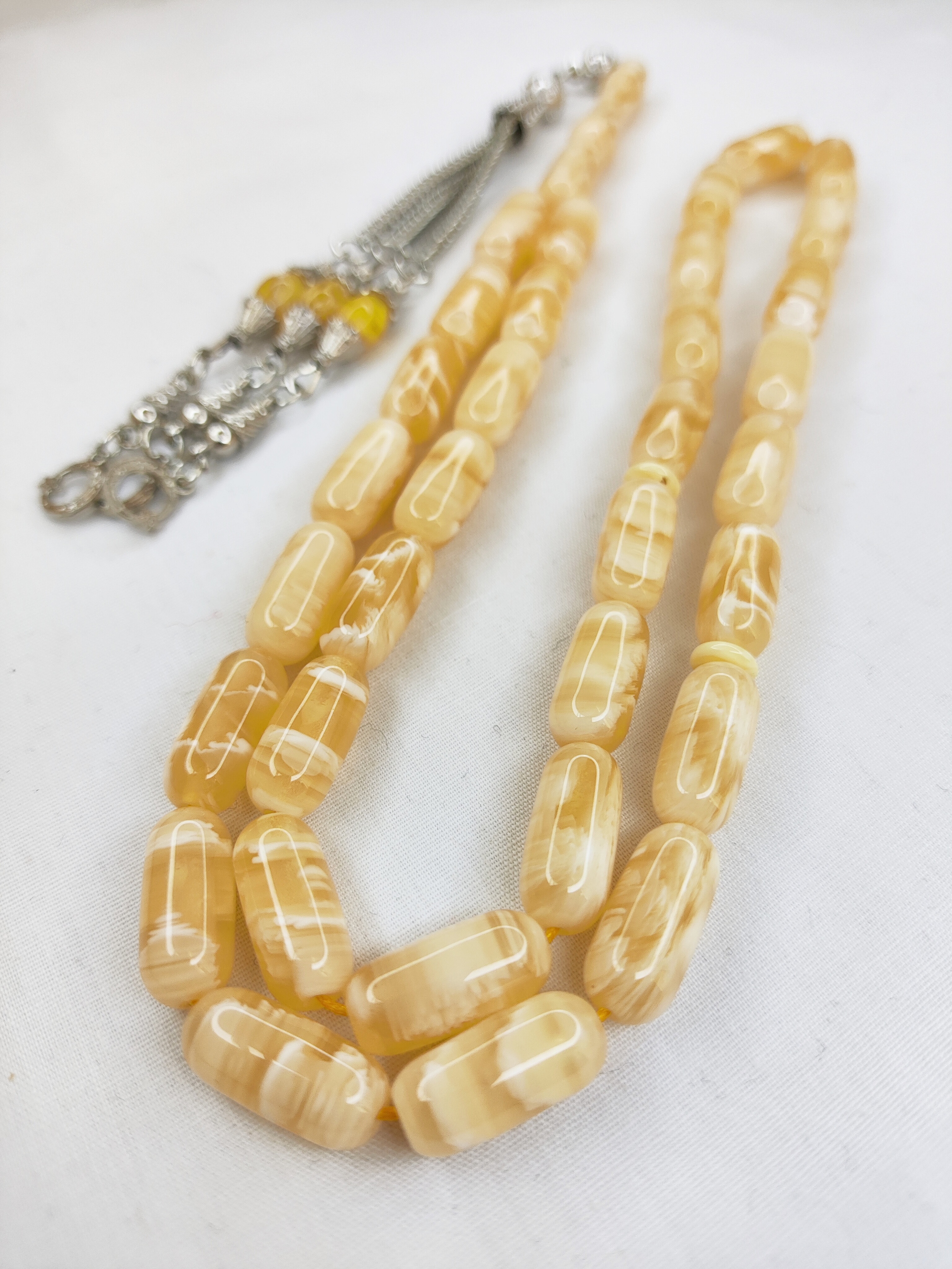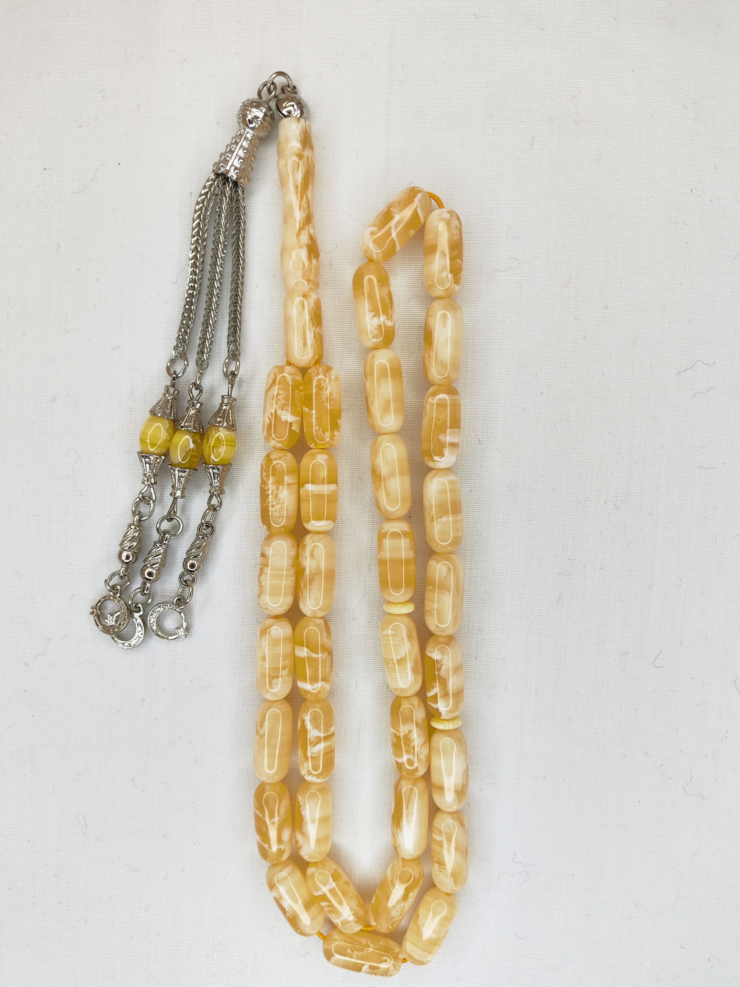 تسبیح کهربا رگه دار 33عددی رنگ یاغبال زیبا و شکیل همراه سر تسبیح استیل