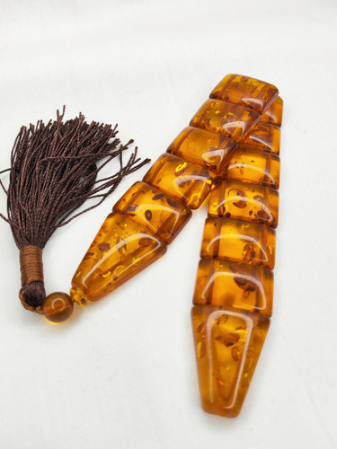 تسبیح زازا کهربا زرافشان رنگ عسلی خوشدست و زیبا همراه منگوله ابریشمی