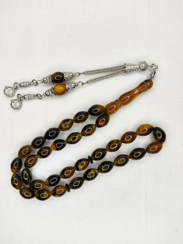 ناموجودتسبیح کهربا رگه دار 33عددی رنگ یاغبال زیبا و شکیل همراه سر تسبیح استیل