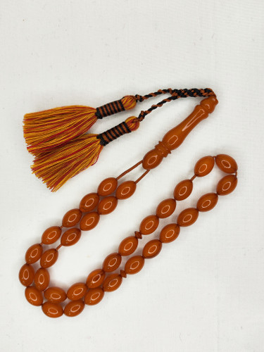 تسبیح کهربا رگه دار 33عددی رنگ یاغبال کره عسلی به همراه بافت شکیل