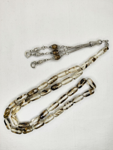 تسبیح کهربا رگه دار ابرو بادی 33عددی تراش کپسولی خوشدست همراه سر تسبیح فلزی زیبا