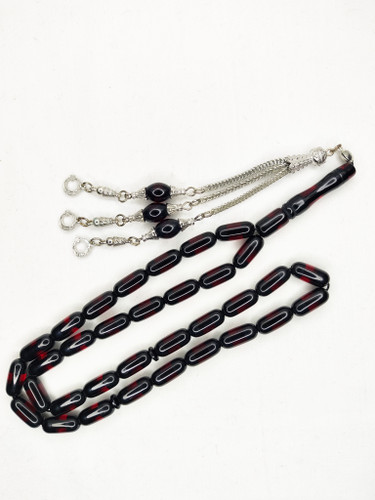 تسبیح کهربا نیم نیم 33عددی رنگ قرمز و سیاه تراش کپسولی خوشدست و زیبا