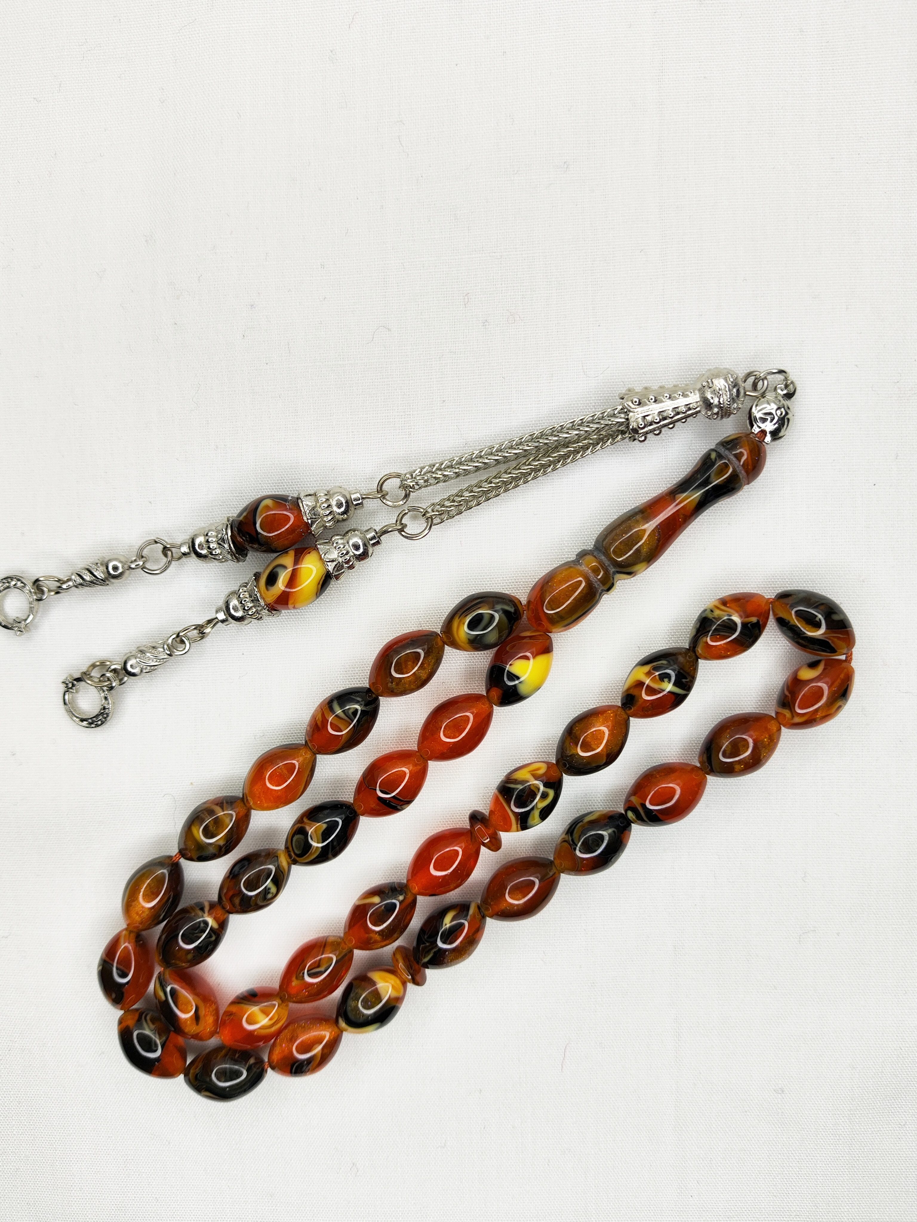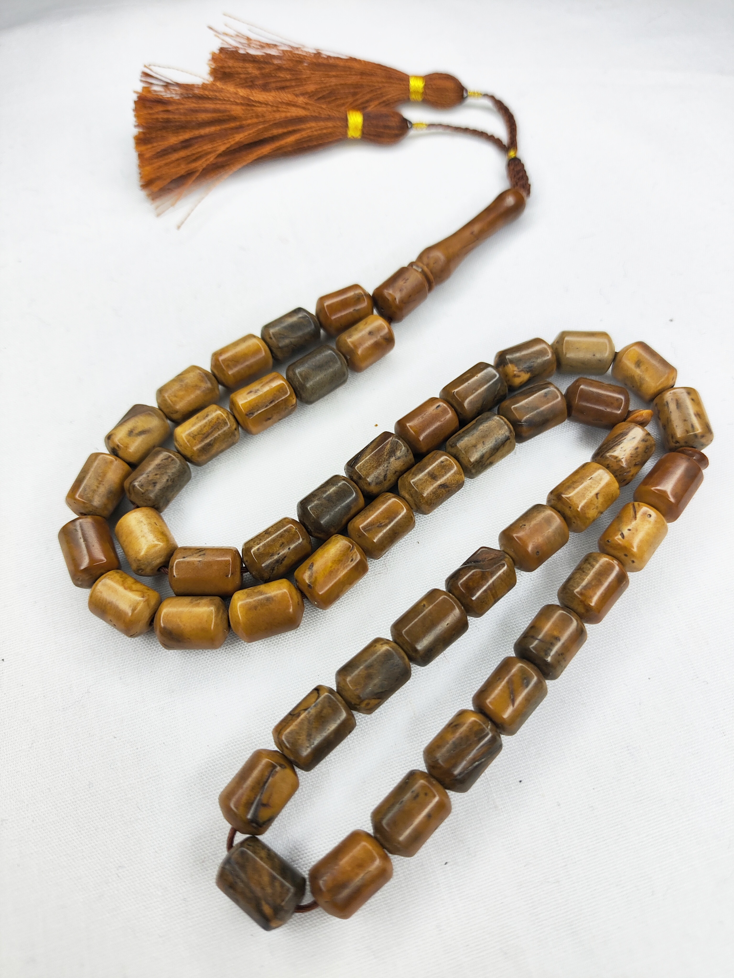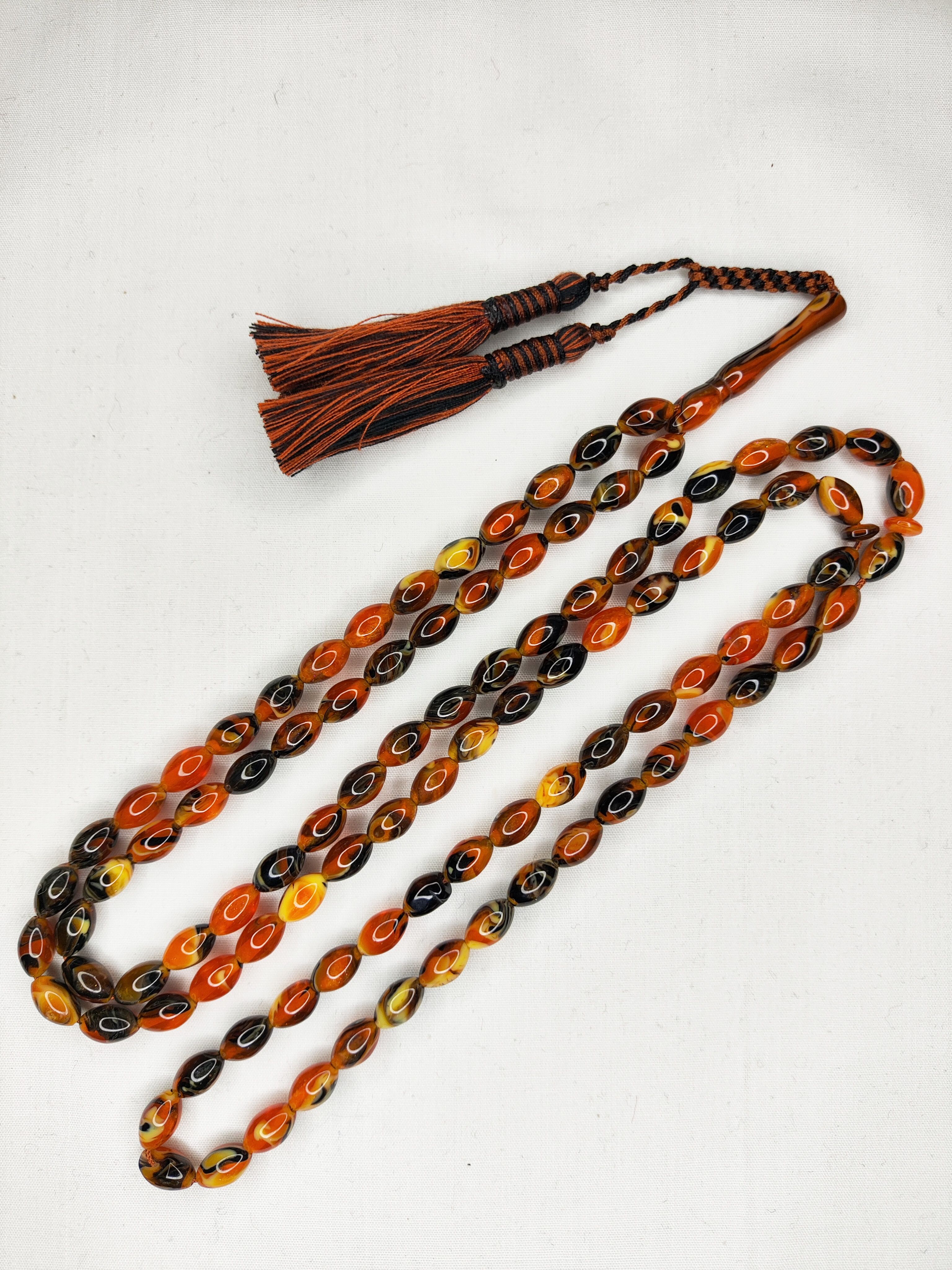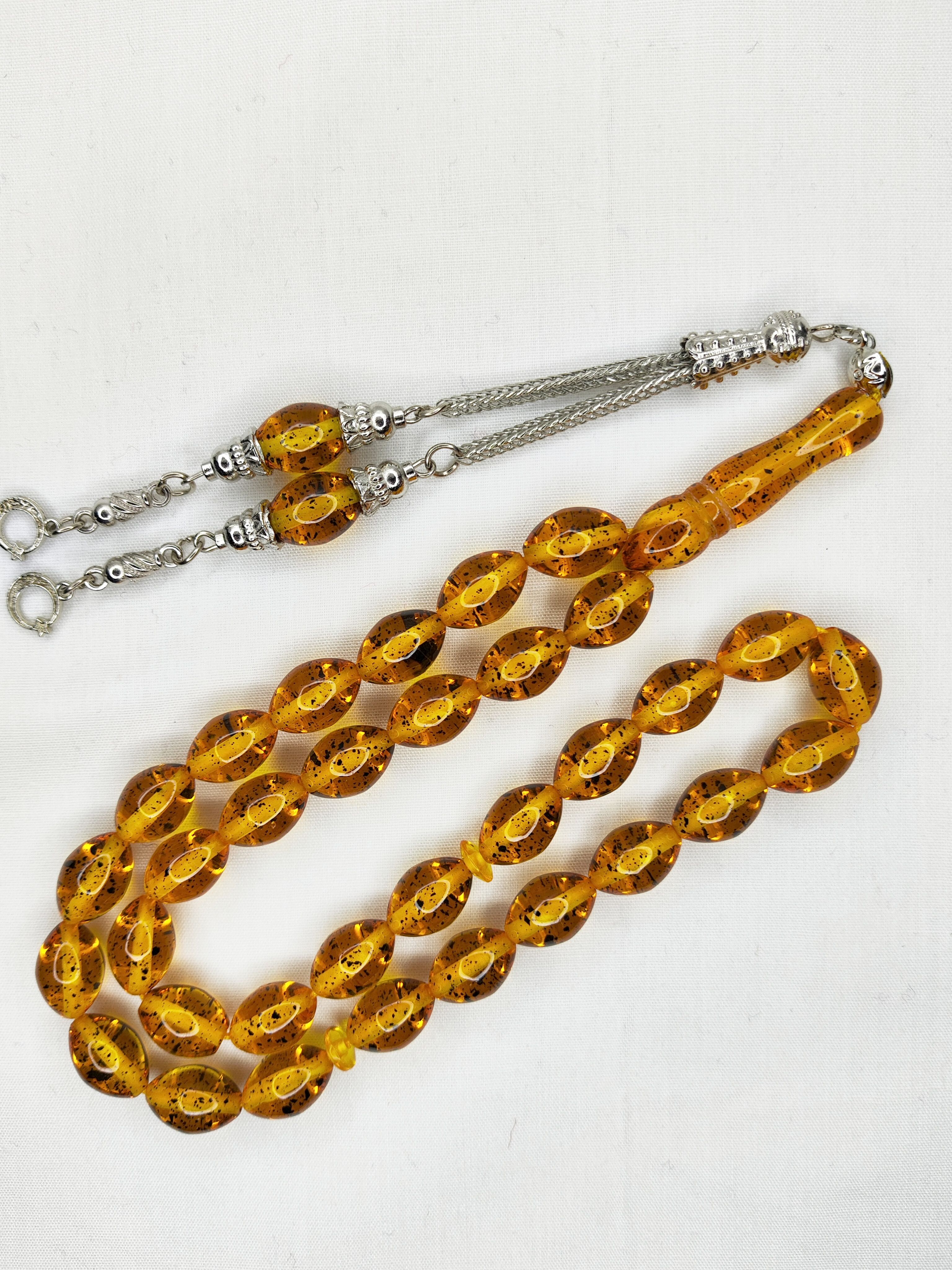 تسبیح کهربا رگه دار 33عددی رنگ یاغبال کره عسلی به همراه بافت شکیل