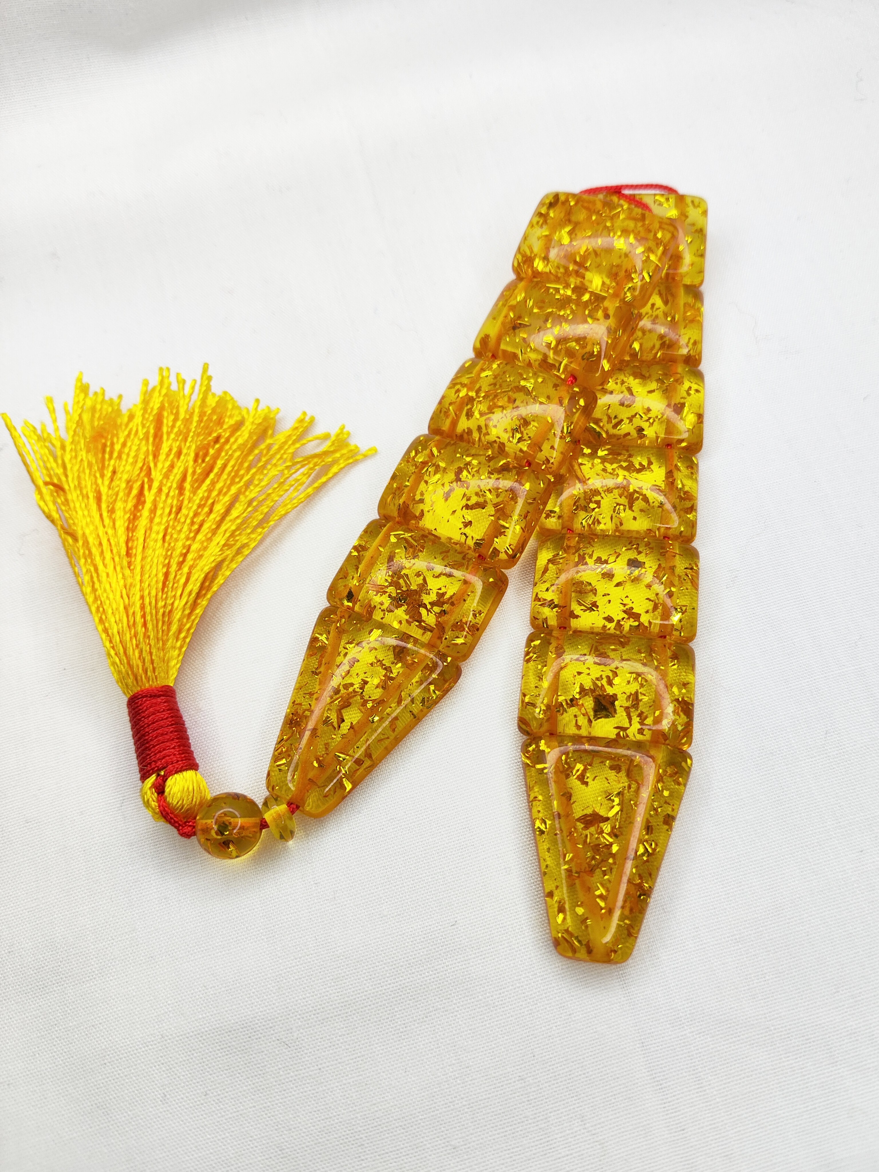 تسبیح زازا کهربا رنگ طلایی زرافشان خوشدست و زیبا همراه منگوله ابریشمی