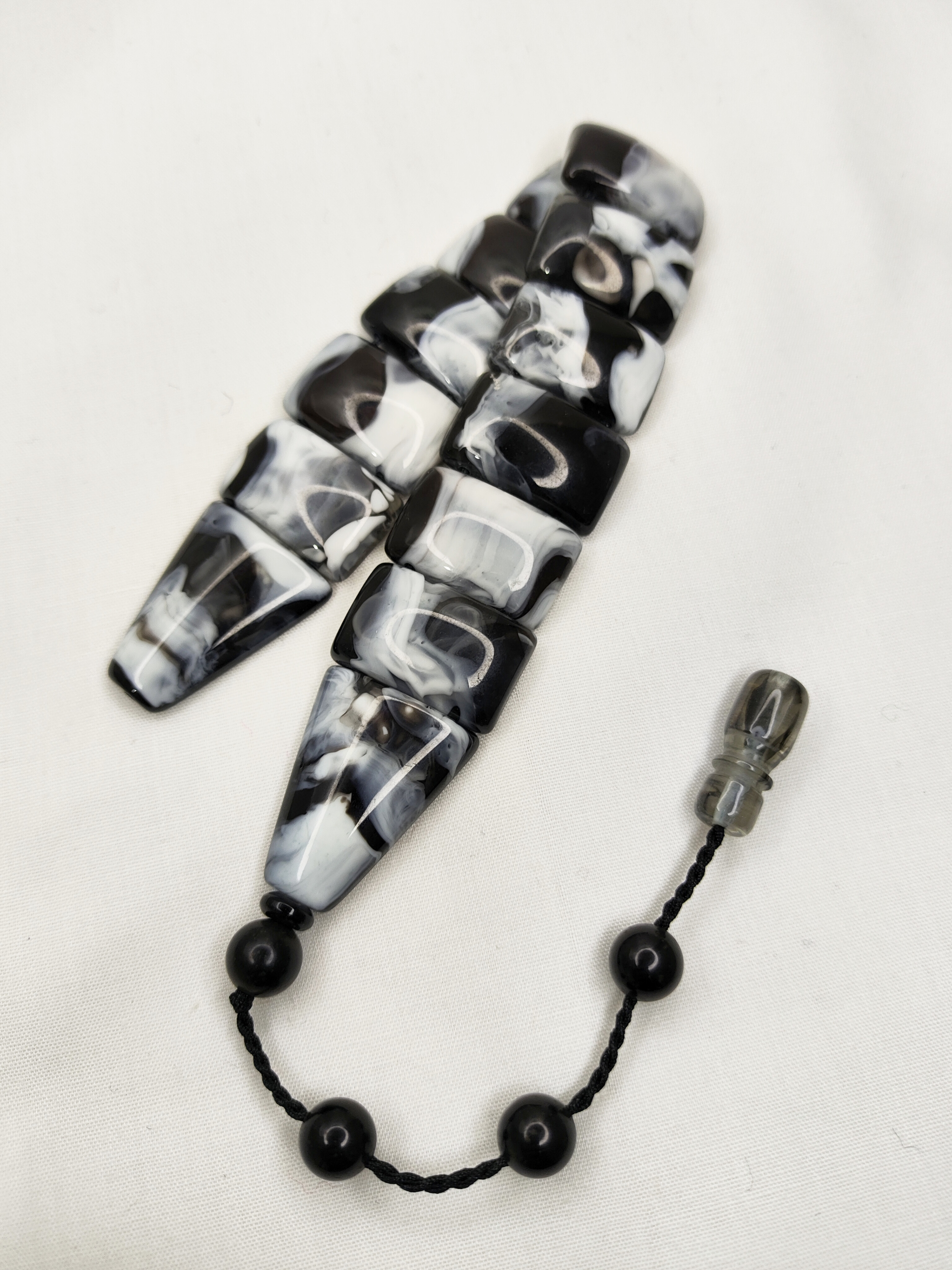 ناموجودتسبیح کهربا 33عددی رنگ سیاه و سفید فاخر همراه سر تسبیح استیل شکیل