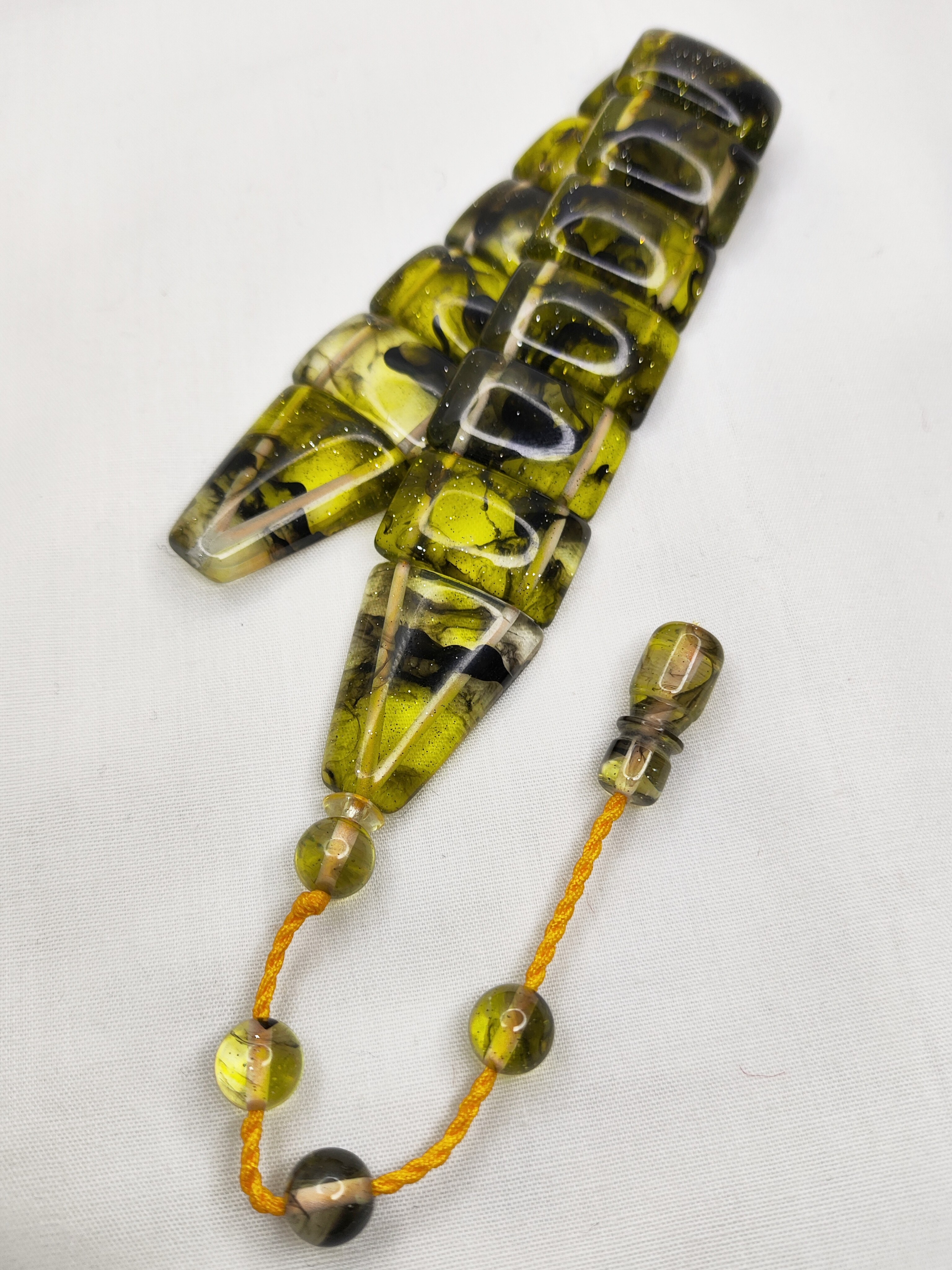 تسبیح کهربا رگه دار 33عددی رنگ زرد کاراملی خوشدست و فاخر همراه بافت شکیل