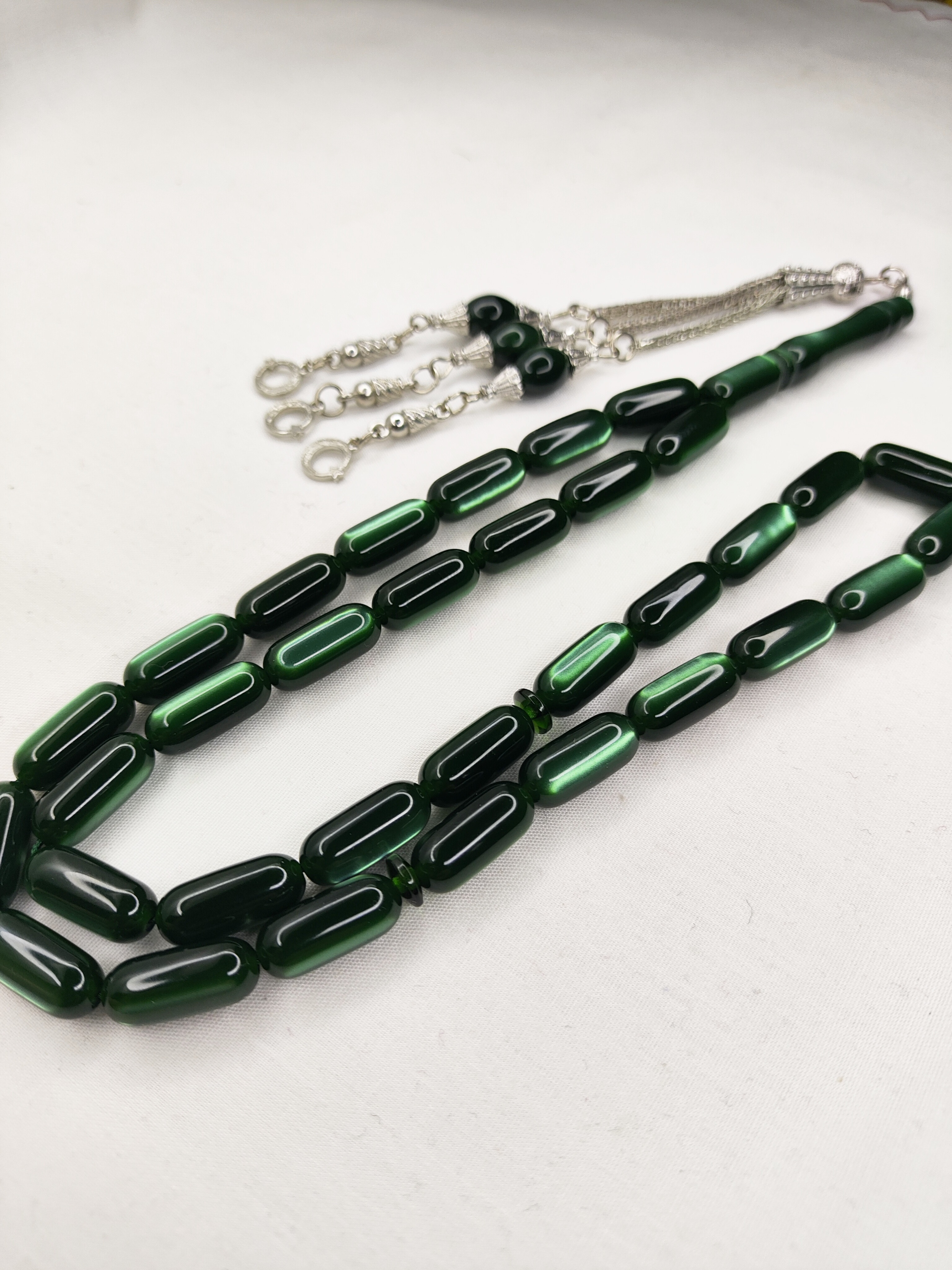 ناموجودتسبیح کهربا 33عددی تراش کپسولی رنگ سبز و زرشکی خوشدست و زیبا همراه با سر تسبیح استیل شکیل